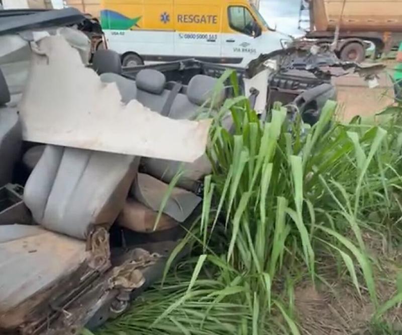 Com o impacto, a carreta tombou no acostamento direito da pista, enquanto a caminhonete foi arremessada para o lado esquerdo.