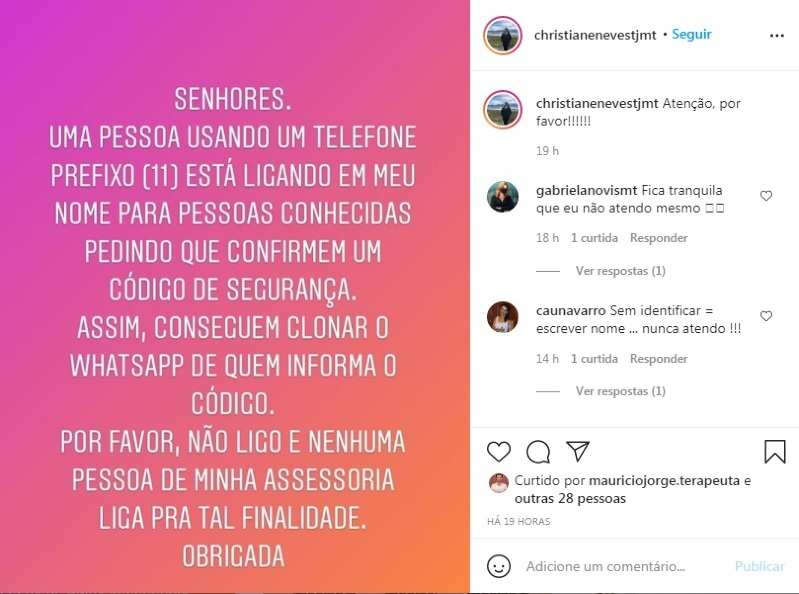 Na postagem, ela alerta seus seguidores que pessoas conhecidas estariam recebendo ligações de um número com prefixo 11, de São Paulo, pedindo que confirmem o código de segurança. "Assim conseguem clonar o WhatsApp de quem confirma o código. Por favor, não ligo e nenhuma pessoa de minha assessoria liga para tal finalidade".