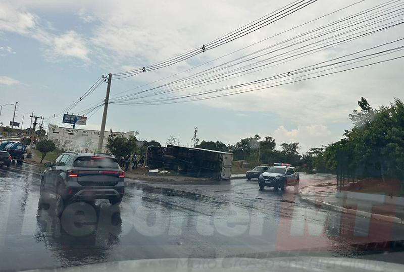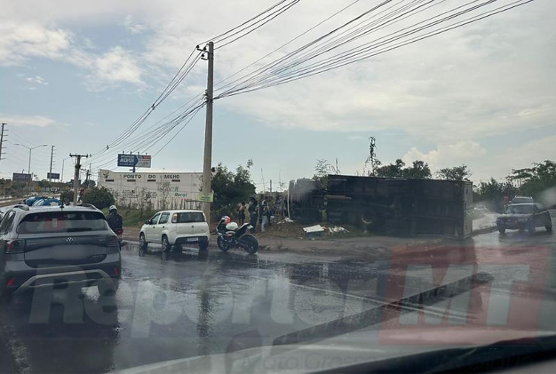 Um motorista ainda não identificado sofreu um grave acidente na manhã de hoje (18), após tombar o caminhão que dirigia em uma rotatória na MT-251, conhecida como Rodovia Emanuel Pinheiro, em Cuiabá. Conforme informações apuradas pelo , o homem ficou caído no chão, aguardando socorro médico.
