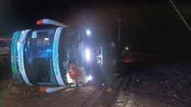 No local do acidente, a equipe do Corpo de Bombeiros constatou o tombamento lateral do ônibus às margens da rodovia, que parou fora da pista. A equipe fez o isolamento da área e verificou riscos como vazamento de combustível e possibilidade de curto-circuito.