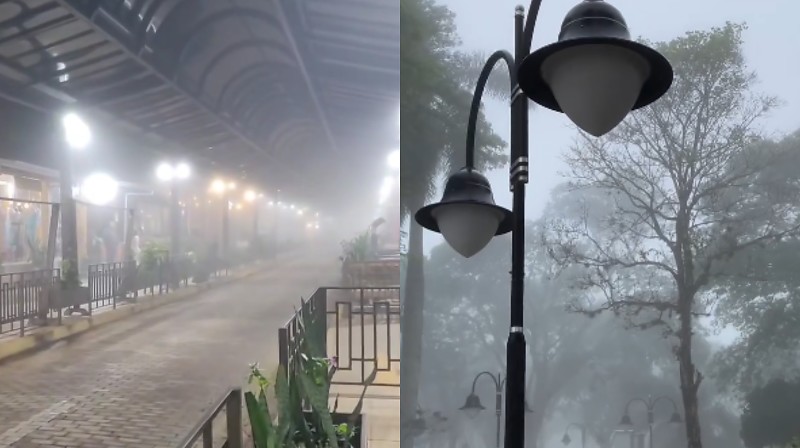 Chapada dos Guimarães (a 67 km de Cuiabá), em Mato Grosso, ficou coberta por neblina na tarde dessa quarta-feira (29). Vídeos que circulam nas redes sociais mostram pontos turísticos da cidade, como a praça Dom Wunibaldo e a Rua Coberta, com clima de inverno. A temperatura registrada era de 19°C.