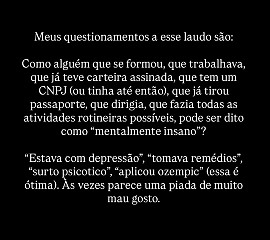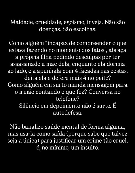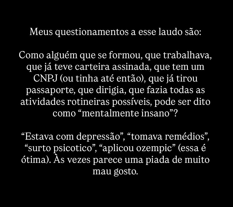 “Como alguém que se formou, que trabalhava, que já teve carteira assinada, quem tem ou CNPJ (ou tinha até então), que já tirou passaporte, que dirigia, que fazia todas as atividades rotineiras possíveis, pode ser dito como ‘mentalmente insano’?”, disse a jovem, que era enteada do feminicida.