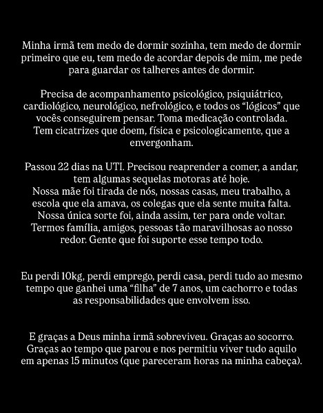 Nas redes sociais, Caroline Fernandes, que agora detém a guarda da irmã, disse que a criança ficou com sequelas tanto físicas quanto psicológicas.